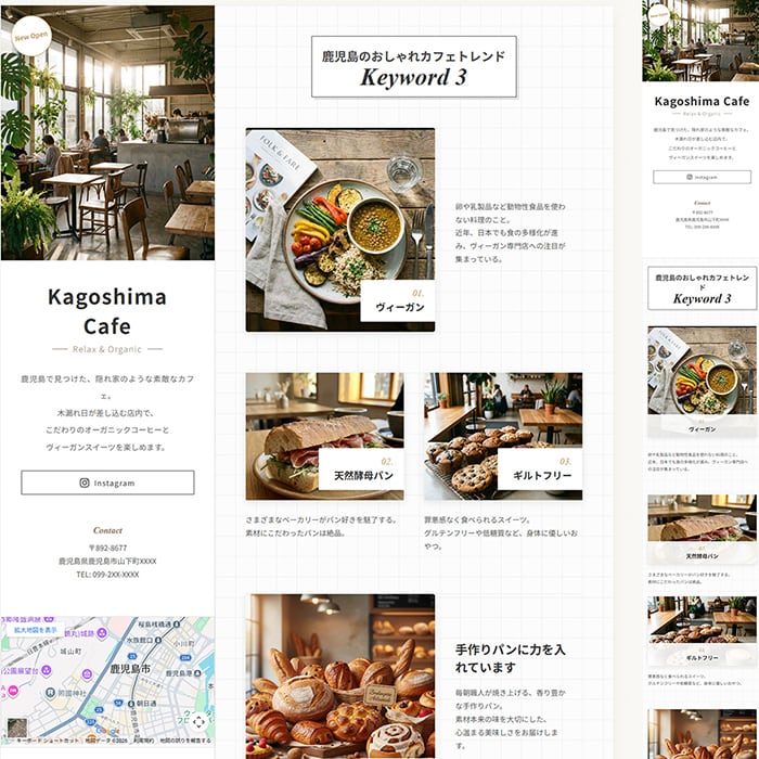 テンプレートを利用することで、レイアウト設計に悩まず、すぐに制作を始められます。画像とテキストを差し替えるだけで、世界観のあるページが完成します。シンプルなHTML / CSS構造なので、自由にカスタマイズできます。